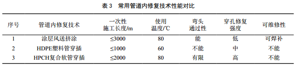 根據現場(chǎng)施工所面臨的條件,從一次性管道修復長(cháng)度、彎頭通過(guò)性、穿孔修復強度等方面進(jìn)行的內修復技術(shù)性能對比結果見(jiàn)表 3。