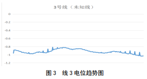 (3)通過(guò)對絕緣接頭保護器接線(xiàn)進(jìn)行電位同步監測,站內線(xiàn)(線(xiàn) 1)電位最大值為﹣1.2 704 Vcse、最小值﹣1.2 949 Vcse,電位波動(dòng)0.02 V;站外線(xiàn)(線(xiàn) 2)最大值為﹣1.6 120 Vcse、最小值﹣1.6 671 Vcse,電位波動(dòng)0.05 V;未知線(xiàn)(線(xiàn) 3)直流電位波動(dòng)較大,最大值為﹣0.8 147 Vcse,最小值﹣1.1 998 Vcse,電位波動(dòng)0.38 V,存在尖峰電壓、直流干擾,并且未知線(xiàn)和站外管線(xiàn)搭接,當存在較大的直流干擾時(shí),可將干擾傳遞至線(xiàn)路陰保恒電位儀(圖 3)。