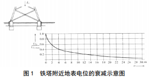 直流輸電線(xiàn)路的桿塔設有接地裝置,當輸電線(xiàn)路出現短路故障或者遭受雷擊時(shí),一部分電流 I G會(huì )從鐵 塔的接地裝置(接地阻抗為 Z G)流入大地,此時(shí)鐵塔電位為 U Gmax=I G×Z G。電流通過(guò)大地向遠處擴散,周?chē)乇黼娢粫?huì )產(chǎn)生一定的電位升U G ,從而使經(jīng)過(guò)的管道對地電位升高。圖 1為鐵塔附近地表電位的衰減示意圖,由此可見(jiàn),當桿塔接地距離管道較近時(shí),短路故障或者遭受雷擊時(shí)管道電位大幅上升,可能擊穿管道防腐層或者對在管道上進(jìn)行測量或維修作業(yè)的人員造成不利影響。