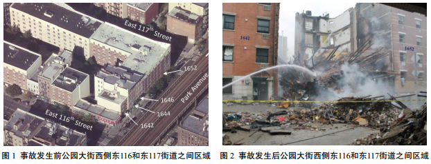 2014年3月12日上午9:30,美國某燃氣管道泄漏爆炸著(zhù)火損壞了兩棟毗鄰的五層大樓。這兩棟大樓坐落在公園大街(Park Avenue)西側,位于紐約市曼哈頓東哈雷姆區東116號和東117號街區之間(圖 1、圖 2)。事故造成8人死亡,超過(guò)50人受傷, 100多戶(hù)家庭疏散。愛(ài)迪生公司(Con Edison)支付的設備損壞、應急響應、修復和管道替換的直接成本超過(guò)190萬(wàn)美元。
