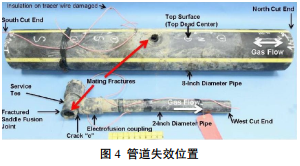 (2)紐約環(huán)保署2006年才對下水管道的缺口進(jìn)行修復,在缺口修復以前地表水和土壤進(jìn)入下水管道,導致燃氣干線(xiàn)失去支撐,管線(xiàn)下沉和熱熔接頭缺陷處的過(guò)載造成管道失效。