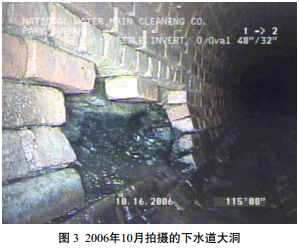 (2)燃氣管道和主水管道下面的土壤被沖刷而流失,并通過(guò)下水道上面的大洞進(jìn)入下水管道中,這個(gè)大洞長(cháng)期成為雨水匯集的地方(圖 3)。