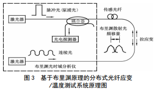 基于布里淵原理的分布式光纖應變監測技術(shù),近兩年有了長(cháng)足的發(fā)展,實(shí)際工程測量精度≤5με。BOTDA采用布里淵光時(shí)域分析技術(shù),系統連接兩根遠端環(huán)接的單模光纖作為分布式傳感器,實(shí)現對被監測對象的應變/溫度信號實(shí)時(shí)采集和分析處理。在BOTDA傳感系統中,配備了一個(gè)用于測量分布式應變和溫度的電光調制器。該技術(shù)基于布里淵散射原理(SBS),利用了光纖中的布里淵散射光頻率變化量(頻移量)與光纖軸向應變或環(huán)境溫度之間的線(xiàn)性關(guān)系來(lái)實(shí)現傳感(圖 3)。
