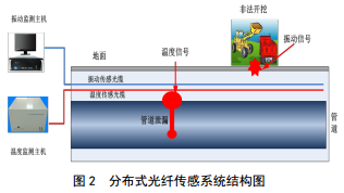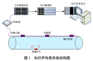 安全監測的重點(diǎn)是在線(xiàn)運行、且超設計壽命周期運行的老舊管道。一條幾百上千公里的管線(xiàn),可能只需要針對高后果區或者局部存在安全隱患的區域實(shí)施安全監測。源自軍工技術(shù)的準分布式光纖聲傳感技術(shù)在這種情況下具有先天優(yōu)勢,只需按照合適的間距 (幾百到幾千米)在管道沿線(xiàn)挖坑黏貼安裝傳感器(無(wú)需動(dòng)火、開(kāi)焊),如果沿途有通信光纜,可用富余的光纖連接傳感器,也可通過(guò)無(wú)線(xiàn)網(wǎng)絡(luò )把采集到的信號上傳至監控中心。無(wú)須沿著(zhù)管道全線(xiàn)開(kāi)挖敷設光纜,工程施工量較小、工期短,組網(wǎng)靈活方便,綜合性?xún)r(jià)比高。準分布式光纖聲傳感系統結構見(jiàn)圖 1。