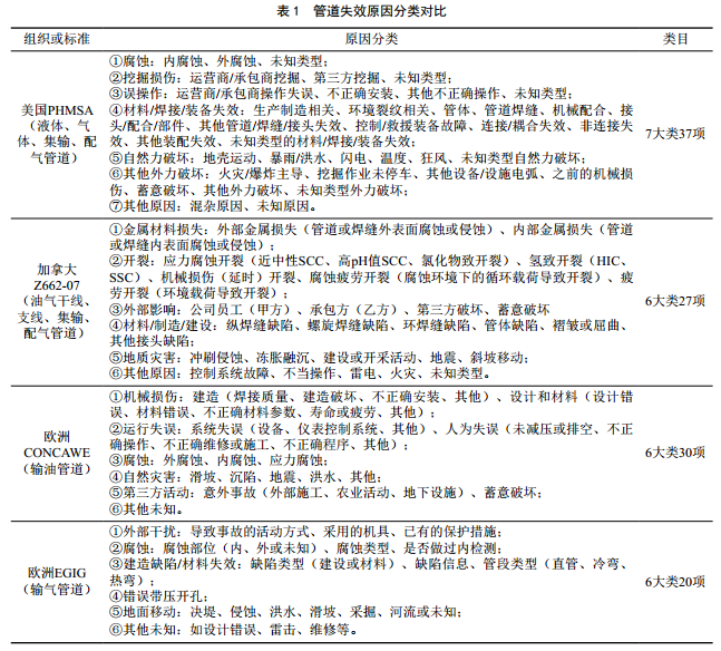 在風(fēng)險評價(jià)過(guò)程中,失效數據的統計非常重要,通過(guò)對管道失效的歷史數據進(jìn)行統計與分析,可以使管道危害因素分類(lèi)更為合理。表 1是國外管道失效數據庫中對管道失效原因的對比與分類(lèi),其中已包括美國運輸部管道與危險材料安全管理局(PHMSA)、加拿大標準協(xié)會(huì )(CSA)、歐洲輸油管道(CONCAVE)和輸氣管道(EGIG)等國際主要的管道失效數據庫[1-6]。