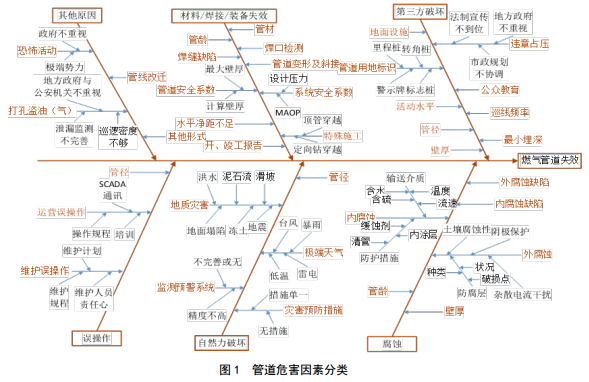綜合上述情況,并考慮到我國油氣管道的具體情況,將管道危害因素分為腐蝕、自然力破壞、第三方破壞、材料/焊接/裝備失效、誤操作及其他原因等6大類(lèi),每類(lèi)又與諸多因素有關(guān),用魚(yú)骨圖細化了各類(lèi)危害因素,如圖 1所示。