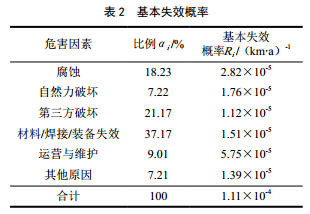 基本失效概率需要通過(guò)大量的統計資料獲得。統計資料來(lái)源于油氣管道事故的歷史記錄,如油氣管道失效數據庫。根據前面對各數據庫油氣管道事故的分類(lèi)統計,按照式(2),計算得到油氣管道基本失效概率如表 2所示。