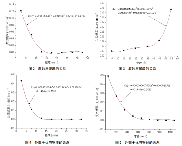 定量指標需要大量的統計數據做支撐。通過(guò)分析管道失效數據庫,可以得到壁厚、管徑、管齡、埋深、鋼級等參數與管道失效概率間的關(guān)系,如圖 2―5,擬合成函數,從而得到這些參數與失效概率間的函數關(guān)系,即定量關(guān)系。