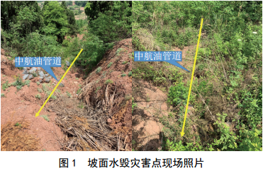 (1)水毀災害。地 質(zhì) 災 害 主 要 以 坡 面 和 河(溝)道水毀為主(圖 1)。需要調閱和調查當地水文資料(暴雨頻率等)、災害點(diǎn)地形地貌(坡長(cháng)等)、管敷情況(埋深等)等 。