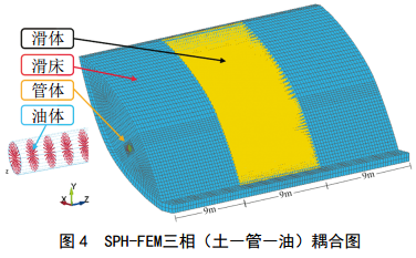 為避免滑坡作用下滑坡體及管內輸送介質(zhì)發(fā)生大形變而致使計算終止,采用光滑粒子流體動(dòng)力學(xué)法(SPH),將問(wèn)題域離散成一系列不依賴(lài)于網(wǎng)格的粒子;針對滑床及管體小變形區域,采用傳統的更具效率的有限元法(FEM),并在其交界面處通過(guò)設置接觸形式,實(shí)現SPH-FEM算法的耦合,最大限度發(fā)揮兩者優(yōu)勢,實(shí)現滑坡下土―管―介質(zhì)多物理場(chǎng)完全耦合建模(圖 4)?紤]模型整體重力,并與時(shí)間相關(guān)聯(lián),最大程度復原滑坡演變過(guò)程,并獲取不同時(shí)刻下管體應力/應變及位移情況,為管體防護工作提供理論支撐與技術(shù)指導。
