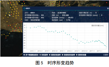 (2)基于InSAR的地質(zhì)災害監控關(guān)鍵技術(shù)。采用衛星遙感監測技術(shù)(InSAR)對成彭管道災害多發(fā)的管段進(jìn)行監測。通過(guò)InSAR廣域處理,對管道全區域進(jìn)行普查,實(shí)現對隱患點(diǎn)變化趨勢的動(dòng)態(tài)跟蹤;并通過(guò)每12天一次的時(shí)序變形監測分析,對有緩慢形變的區域及時(shí)分析和預警,對已變形的災害區域二次預 警和防范。專(zhuān)題數據包括所有形變點(diǎn)云的經(jīng)緯度位置信息,形變速率,內檢驗經(jīng)度信息,每一時(shí)刻形變量信息。專(zhuān)題圖表包括管線(xiàn)區域的形變速率、時(shí)序形變趨勢、累積形變量、形變面積、沉降區域的邊界等信息(圖 5)。