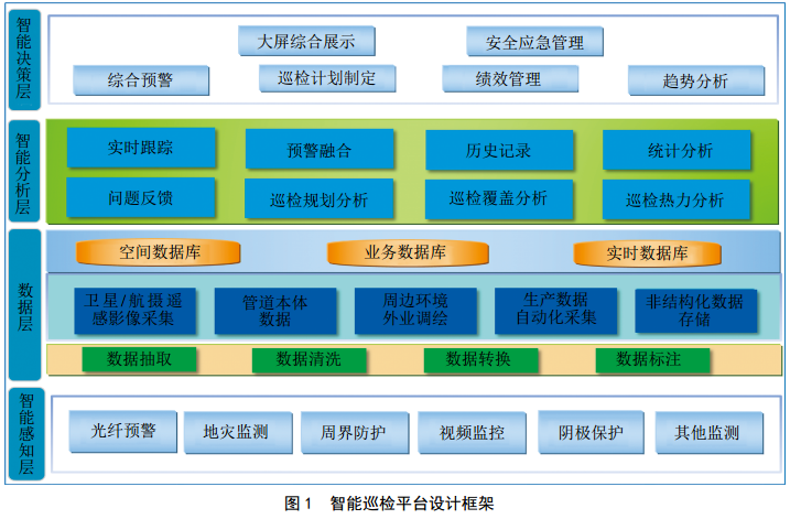 按照“需求導向、頂層設計、分步實(shí)施、創(chuàng )新驅動(dòng)”的建設原則,應用移動(dòng)互聯(lián)網(wǎng)、云計算、大數據等信息技術(shù),融合各類(lèi)安全預警系統實(shí)時(shí)報警數據,建立管道智能巡檢平臺,形成一體化管理。平臺框架包括智能感知層、數據平臺層、智能分析層、智能決策層四個(gè)部分(圖 1)。