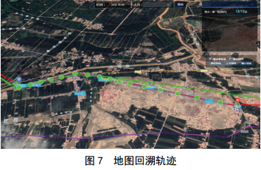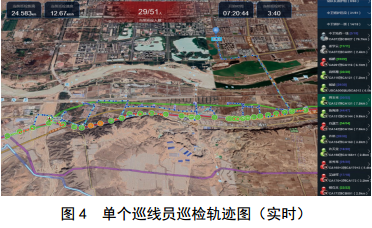 (1) 實(shí) 時(shí) 跟 蹤 。 系 統 推 出 巡 檢 數 據 一 張 圖(圖 3)概念,將巡檢過(guò)程中的關(guān)鍵要素信息,實(shí)時(shí)展示在一張巡檢地圖中,包括巡檢總人數、在線(xiàn)人數、班組及相關(guān)巡檢人員的在線(xiàn)和離線(xiàn)情況,綜合顯示巡護區段的各班次巡檢任務(wù)執行情況。對于單一巡檢個(gè)體,在圖中顯示該巡檢人員巡護區段內的必經(jīng)點(diǎn)完成情況、巡檢軌跡、開(kāi)始時(shí)間、結束時(shí)間、有效巡檢時(shí)長(cháng)、巡檢距離。如出現不符合巡檢要求的情況,系統將實(shí)時(shí)在手機APP終端、巡檢監控中心兩端進(jìn)行報警,自動(dòng)監督糾正巡檢人員的違規行為,有效削減漏巡、巡檢時(shí)長(cháng)不夠、巡檢超有效范圍、超速巡檢等巡護風(fēng)險。系統每15秒一次實(shí)時(shí)上傳巡檢人員的位置、時(shí)間等動(dòng)態(tài)信息,其巡檢軌跡實(shí)時(shí)繪制在巡檢地圖中(圖 4),直觀(guān)顯示巡檢軌跡與管道的空間關(guān)系,判斷巡檢的有效性。