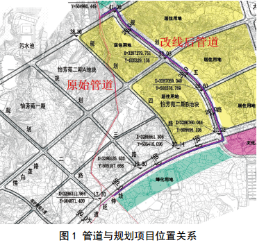 天然氣管道前期建設時(shí),管道路由基本選擇丘陵及水田,絕大部分按二級地區設計,后期由于地方規劃建設,規劃用地逐漸靠近、圈占管道,造成管道周邊地區等級升高,形成新的高后果區。以典型的Ш級高后果區JJ-JC-HCAs002為例, 2009年建設時(shí)原管道沿地形敷設于丘陵地段,按二級地區設計,管道壁厚為7.1 mm,管徑為508 mm,設計壓力為6.3 MPa。2013年,當地將管道途經(jīng)路由段規劃為芳蘭組團項目,擬建設大量安置房及配套設施,管道斜穿規劃用地,涉及管道長(cháng)度約2.5 km,如圖 1所示。
