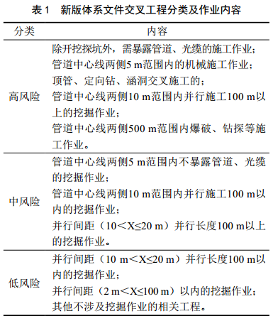核心是落實(shí)“四防措施”,即人防、物防、技防和信息防相結合,構建管道安全保護防護體系,提升主動(dòng)感知預防風(fēng)險能力。陜京管道按照公司新版體系文件對交叉工程施工風(fēng)險類(lèi)型重新分類(lèi) ,由大型、中型、小型交叉工程管理,改為高風(fēng)險、中風(fēng)險、低風(fēng)險交叉工程進(jìn)行管控(表 1)。新修訂的管控措施更為科學(xué)、合理和適用。高、中、低風(fēng)險的交叉工程分別實(shí)行一、二、三級布控,同時(shí)根據現場(chǎng)風(fēng)險采取人防、物防、技防等措施;對中、高風(fēng)險交叉工程或周邊工程建立施工動(dòng)態(tài)微信群,及時(shí)獲取施工信息,落實(shí)信息防。