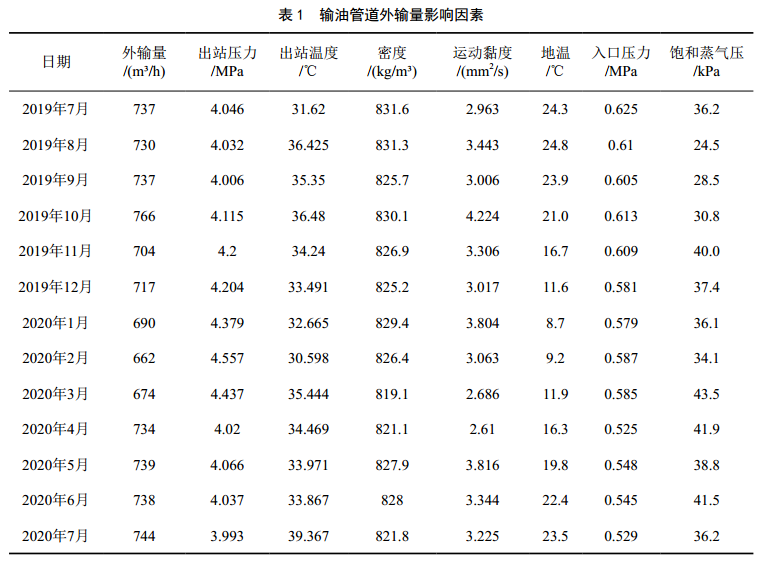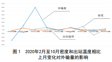 統計2020年2月至10月密度和出站溫度相比上月變化對外輸量的影響,詳見(jiàn)圖 1。其中1月至2月外輸量下降明顯,隨即開(kāi)展緊急清管作業(yè),清出管道內壁結蠟,恢復管道外輸能力, 3月至4月外輸量顯著(zhù)提升。5月后外輸量趨于正常,在工藝流程不發(fā)生變化情況下,外輸量與出站溫度成正比,隨出站溫度升高而增大;外輸量與密度成反比,隨油品密度增高而降低。