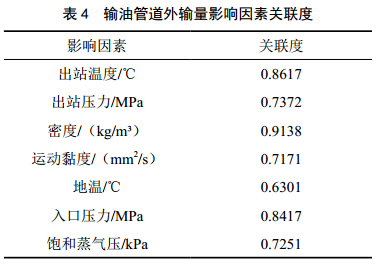 由此可得出輸油管道外輸量影響因素關(guān)聯(lián)度大小,見(jiàn)表 4。