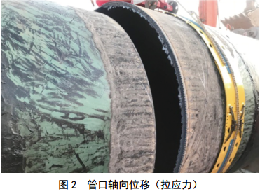 管口位移形式主要有徑向位移和軸向位移兩種。徑向位移即管道在切管斷開(kāi)后,兩道管口之間會(huì )發(fā)生上下左右各個(gè)方向的瞬間錯邊位移,如圖 1所示。軸向位移則根據管道在軸向上的受力有所不同,如管 道受拉應力,則切管中即將切斷時(shí),管體瞬間撕開(kāi)(圖 2);如管道受擠應力,則管道即將斷開(kāi)時(shí)兩道管口之間的距離變小,造成管口之間相互擠壓。由于管道所受應力復雜,斷管后管口位移情形差別也較大,管口應力聚集的巨大能量得到瞬間釋放,威脅人員及設備安全。