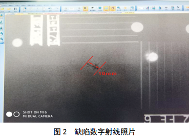 對存在缺陷的管段現場(chǎng)換管取樣,所切取樣品如圖 1所示。對缺陷位置進(jìn)行數字射線(xiàn)檢測復核,如圖 2所示,檢測人員根據射線(xiàn)照片,判斷缺陷為裂紋的可能性較大。