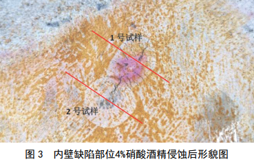 對樣品內壁打磨后用4%硝酸酒精對該缺陷位置進(jìn)行侵蝕,內壁缺陷部位顯示出兩處呈圓形且與管體母材明顯區分的區域,如圖 3所示,在兩處圓形缺陷位置切取金相樣品,進(jìn)行截面金相、電鏡顯微組織觀(guān)察。