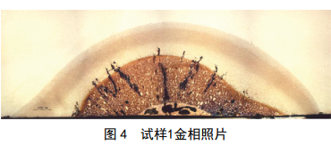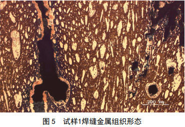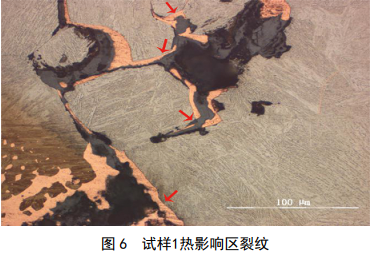 試樣經(jīng)過(guò)鑲嵌、研磨和拋光, 4%硝酸酒精侵蝕后,在金相顯微鏡下觀(guān)察,試樣 1宏觀(guān)可見(jiàn)明顯焊接特征區域——焊縫區和熱影響區,如圖 4所示。焊縫區內存在大量焊接缺陷和裂紋,組織形態(tài)如圖 5所示,焊縫區裂紋為沿柱狀晶方向開(kāi)裂的結晶裂紋。在熱影響區也存在沿晶裂紋,且在晶界處發(fā)現黃色物質(zhì),如圖 6中箭頭所指,同時(shí)在裂紋內有灰色氧化物存在。