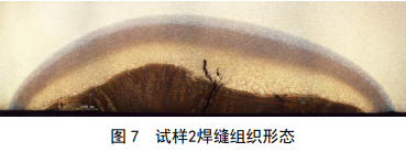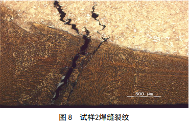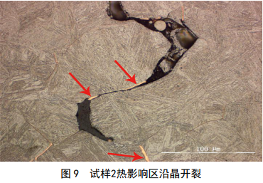 試樣 2組織形態(tài)如圖 7所示,在焊縫區存在沿柱狀晶方向開(kāi)裂的裂紋,沒(méi)有發(fā)現其它焊接缺陷,如圖 8所示。在熱影響區同樣存在沿晶裂紋,裂紋內有灰色氧化物和黃色物質(zhì),如圖 9中箭頭所示。