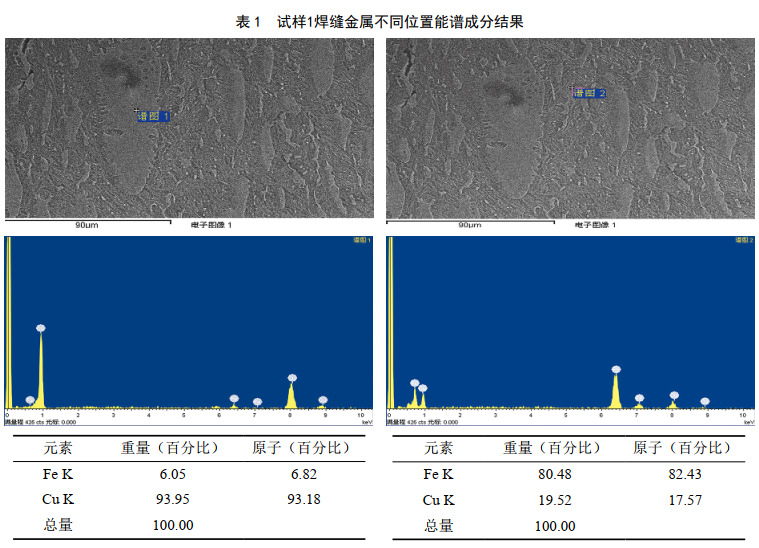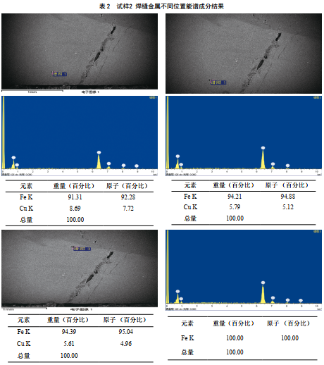 為了確定焊縫區及熱影響區晶界分布的黃色物質(zhì)成分,在掃描電鏡下對其進(jìn)行能譜分析。試樣 1焊縫金屬不同區域能譜分析結果見(jiàn)表 1,其中白色區域的Cu含量很高(重量百分比達到93.95%),灰色區域的Cu含量為19.52%,不同相的含Cu量差別較大。試樣2焊縫金屬中不同相成分分析結果見(jiàn)表 2,其焊縫金屬中也含有一定量Cu,但各微區Cu含量的差別不大,分別為8.69%、 5.79%和5.61%,比試樣 1焊縫中Cu含量少。熱影響區裂紋中的黃色物質(zhì)全部為Cu,灰色物質(zhì)為Fe的氧化物。