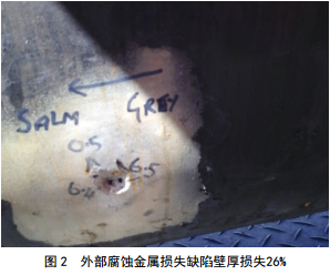 金屬損失是引起管道缺陷最常見(jiàn)的問(wèn)題,是已知許多腐蝕問(wèn)題的根源(金屬損失也可能由于機械損壞或施工問(wèn)題而發(fā)生)。該案例管道于2009年檢測時(shí),工程人員發(fā)現了嚴重缺陷并進(jìn)行了修復。 2015年再次檢測,并計劃維修壁厚損失約20% 的兩處缺陷。因缺陷位置未知,在500 m長(cháng)的管道上進(jìn)行了SCT檢測 。經(jīng)結果對比,第一處缺陷與SCT的報告相符,并且為應力水平最高的缺陷,其應力水平為材料最小屈服強度 (SMYS)的67% ,而內檢測報告的壁厚損失為26% 。圖 2為2015年管道缺陷圖片。