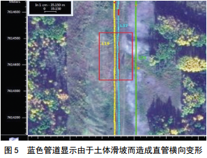 檢測管壁應力而非幾何尺寸變化的另一個(gè)優(yōu)點(diǎn)是可以檢測到給管道施加局部應力的任何外部載荷,但 SCT無(wú)法確定應力集中的根源。 在這種情況下,這種技術(shù)的另一種能力也變得非常有益,即SCT關(guān)于管道路線(xiàn)及其埋深報告數據有助于確定因地下土體運動(dòng)引起的管道嚴重變形。 報告顯示管道埋深發(fā)生了變化,表明管道遭受了地質(zhì)滑坡的影響。 同一區域管道向上彎曲而造成應力值較高的SCZ,表明地下土體運動(dòng)對管道造成了結構性破壞。 圖 5為管道橫向變形的頂視圖。