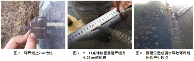 SCT能夠檢測焊縫附近或焊縫上是否存在焊接缺陷或腐蝕。案例中, SCT檢測到一個(gè)腐蝕點(diǎn),尺寸為 638 mm×180 mm,最大深度為壁厚的8% 。 管道壁厚沿環(huán)焊縫方向發(fā)生變化,為了管道對齊導致管道另一側產(chǎn)生凹陷。 圖 6顯示12點(diǎn)鐘位置的焊縫錯位,圖 7顯示10點(diǎn)鐘位置的凹痕。圖 8所示為錯位和凹陷導致涂層下進(jìn)水并引起點(diǎn)狀腐蝕。