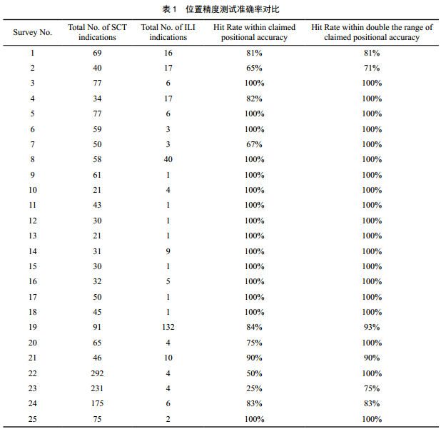 針對內檢測結果,對SCT報告的25個(gè)結果進(jìn)行了對比研究。 如果內檢測報告在SCZ一定范圍內有一個(gè)缺陷,則計算為一個(gè)準確檢測點(diǎn)。 SCZ的位置精度為±1 m(表 1)。