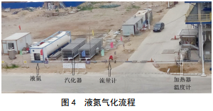 氮氣源包括氮氣瓶組、制氮車(chē)現場(chǎng)制氮和液態(tài)氮汽化三種方式。為保證注氮作業(yè)的壓力和連續性,注氮作業(yè)選取液氮,氮氣純度在99%以上,注入管道前通過(guò)加熱器加熱,保證不低于5℃,以防止氮氣溫度過(guò)低對管道造成危害(圖 4)。