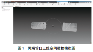 三維激光掃描技術(shù)又稱(chēng)“實(shí)景復制技術(shù)”,即通過(guò)對物體空間外形和輪廓進(jìn)行激光掃描,快速、大范圍采集得到物體表面的點(diǎn)云數據(即空間三維坐標數據),并利用相關(guān)軟件建立物體的實(shí)景三維模型[4]。采用激光測量,以主動(dòng)非接觸方式快速獲取目標表面的三維空間坐標數據,反映目標實(shí)時(shí)現狀;數據量大,點(diǎn)位精度高[5]。用FARO高速三維激光掃描儀掃描換管作業(yè)兩端管口,基于相位偏移技術(shù),掃描儀持續向外投射不同波長(cháng)的紅外光,接觸到對象后反射回到掃描儀,通過(guò)測量紅外線(xiàn)光波的相位偏移,即可準確判斷掃描儀到對象的距離。使用角度編碼器測量FARO激光掃描儀的鏡像旋轉和水平旋轉,計算各點(diǎn)的X、 Y、 Z坐標。用掃描儀SCENE軟件過(guò)濾處理兩端管口的三維空間數據模型見(jiàn)圖 1。