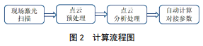 計算流程見(jiàn)圖 2,計算步驟包括:①現場(chǎng)激光掃描管道,獲取管道及管口點(diǎn)云數據;②利用SCENE 軟件對點(diǎn)云數據進(jìn)行預處理,包括濾波、剪裁;③計算軟件對預處理后的點(diǎn)云數據進(jìn)行處理分析,特征識別,優(yōu)化擬合;④獲取管道及管口下料參數數據。