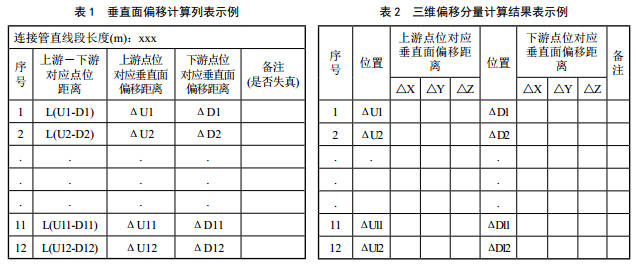 大口徑管道直管段更換作業(yè)計算過(guò)程示意見(jiàn)圖 3,定義兩個(gè)端面分別為上游端面(U)和下游端面(D),從端面的最高點(diǎn)起,按順時(shí)針?lè )较驅A周等分為12份,對應的點(diǎn)位分別為U1、 U2、 U3…U12和D1、 D2、 D3…D12。 軟件自動(dòng)計算各位置的距離和偏移量,以表1形式展示。三維坐標軸上的各個(gè)偏移分量計算結果如表 2示例。