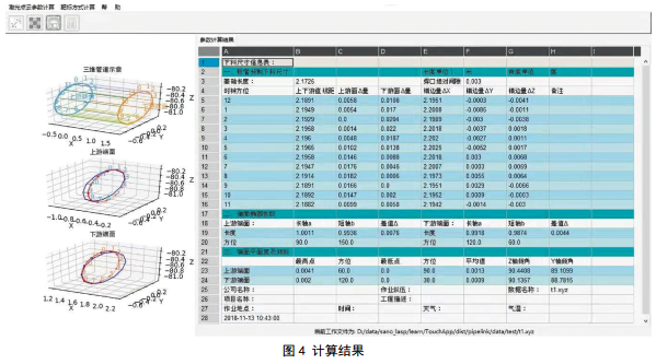 現場(chǎng)掃描耗時(shí)2分30秒,掃描完成后, SCENE軟件對數據預處理,用時(shí)6分30秒。計算軟件讀取掃描數據后,一鍵完成分析、提取、計算、建模和展示,自動(dòng)采點(diǎn)測量建模和數據處理用時(shí)2分鐘,計算結果見(jiàn)圖 4。完成以上各步驟總時(shí)長(cháng)為14分鐘,相比人工測量計算縮短了大量時(shí)間。