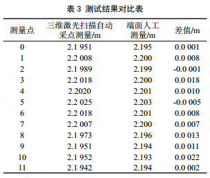 隨后組織 經(jīng) 驗 豐 富 的 管 工 、 焊 工 和 技 術(shù) 員 人工實(shí)測,測量結果對比見(jiàn)表 3?梢钥 出 , 三 維激 光 掃 描 自 動(dòng) 采 集 測 量 計 算 與 人 工 測 量 差值為﹢0.0 022 m~﹣0.0 005 m,最大差值為0.0 027 m,數據吻合度較高。