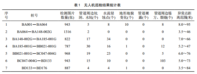 鄂爾多斯作業(yè)區管轄陜京四線(xiàn)管道逾370公里,穿越庫布其、毛烏素沙漠段180余公里,途經(jīng)丘陵、溝壑105公里,穿越大型河流、鐵路、公路62處,管道沿線(xiàn)水工640余處,具有沿線(xiàn)地貌差異大、線(xiàn)路長(cháng)、巡線(xiàn)難度大等特點(diǎn)。以智能巡檢系統管理平臺、采用縱橫TX-20和TX-10垂直起降固定翼無(wú)人機對該段管道進(jìn)行巡檢,累計飛行時(shí)間8.3小時(shí),總覆蓋面積97平方公里,處理航拍圖片6 666 張。通過(guò)圖像識別發(fā)現多處隱患,結果統計如表 1所示。
