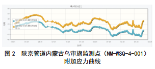 目前陜京管道共安裝監測點(diǎn)100多處,覆蓋陜京一線(xiàn)、二線(xiàn)、三線(xiàn)、四線(xiàn)和大唐煤制氣管線(xiàn)、永唐秦管線(xiàn)等(圖 1)。陜京四線(xiàn)內蒙古輸氣管理處已安裝16處,系統運行良好。由圖 2烏審旗監測點(diǎn)28個(gè)月監測數據可知,管道所受最大附加應力均在60 MPa以下,遠不及三級應力報警閾值126 MPa。該監測點(diǎn)監測期間無(wú)地質(zhì)災害發(fā)生。