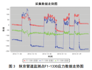 2014年11月底至2015年2月初,陜京管道某壓氣站下游的兩個(gè)監測點(diǎn)S1a-1330和S1a-1333-7應力數據變化較大,局部數據達到了三級報警閾值,從圖 3可 以明顯看出數據成間歇波峰狀,表明管道在特定時(shí)間段受到較大附加應力。