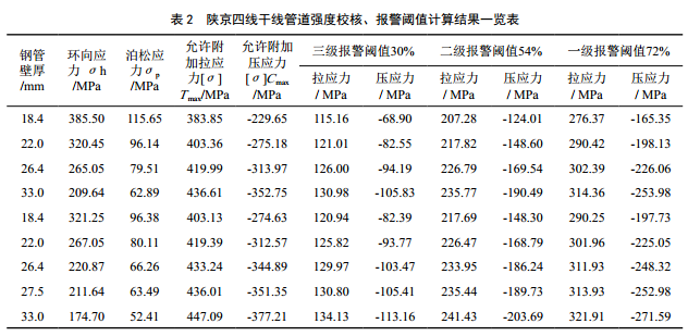 參考中石油企業(yè)標準,三級預警閾值設置原則如下:管體附加應力超過(guò)允許附加應力 [σ ]Tmax或[σ ]Cmax 的30%,發(fā)布三級預警;超過(guò) [σ ]Tmax或[σ ]Cmax的60%,發(fā)布二級預警;超過(guò) [σ ]Tmax或[σ ]Cmax的90%,發(fā)布一級預警。