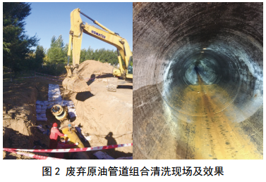 2016年,中國石化管道儲運有限公司將12.8 km某改線(xiàn)廢棄管道改為輸水管道,與該段廢舊管道土地資產(chǎn)全部有償移交地方,用于城市工業(yè)供水。采用清管器與化學(xué)試劑相結合的組合清洗方式清除管壁油污和結蠟,清洗后管道內壁無(wú)油污、可燃氣體含量達標(圖 2)。