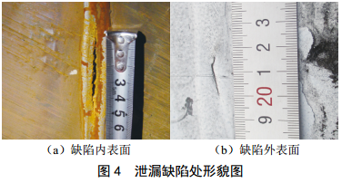 試樣在3.6 MPa、 7.2 MPa、 12.0 MPa(設計壓力)、 13.2 MPa(管道現場(chǎng)水壓試驗壓力值)和16.0 MPa(鋼管出廠(chǎng)時(shí)的水壓壓力)標準靜水壓條件下分別保壓900 s、 900 s、 1 800 s、 900 s和900 s,未發(fā)生泄漏;繼續加壓至23.5 MPa時(shí),焊縫裂紋處泄漏,爆口內表面長(cháng)度約為55 mm、外表面長(cháng)度約為16 mm,泄漏缺陷處內外形貌如圖 4所示。