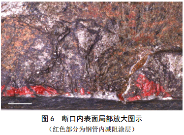 如圖 6所示,斷口的另一個(gè)明顯特征是環(huán)氧樹(shù)脂減阻劑已經(jīng)進(jìn)入了缺陷內部,證明該缺陷在鋼管出廠(chǎng)前已經(jīng)存在。