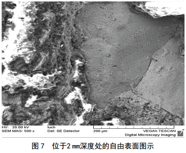 焊接缺陷區深度約為6.4 mm,存在自由表面、最深為2 mm,如圖 7所示,考慮為熔合不良。焊接缺陷區上部有斷裂痕跡,且斷面不平整,考慮為焊接熱裂紋,即由于低熔點(diǎn)夾雜存在,導致夾雜凝固時(shí)被焊接拉應力拉開(kāi)。