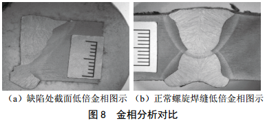 如圖 8所示,在裂紋缺陷區域切取一個(gè)金相截面進(jìn)行觀(guān)察,與正常的螺旋焊縫金相低倍照片相比可知:裂紋處進(jìn)行了補焊;根據補焊焊道情況,確認補焊為外補焊,但補焊深度沒(méi)有達到內表面。結合斷面上發(fā)現的內表面原始缺陷,說(shuō)明補焊沒(méi)有消除內表面焊接原始缺陷。