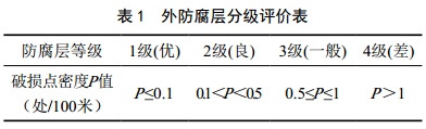 站場(chǎng)管道長(cháng)度短、支管多、管道接地點(diǎn)密集,施加的電流信號通過(guò)接地體流入整個(gè)管道和接地系統,導致管道在某些位置出現電流疊加,因此不能按照電流衰減來(lái)計算防腐層整體質(zhì)量,對于采用三層聚乙烯復合結構防腐層的埋地管道,可以根據表 1對埋地管道外防腐層進(jìn)行分級評價(jià)[4]。