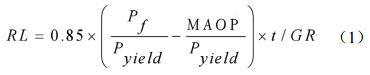式中RL 腐蝕壽命, a年; C 年校正系數; P f計算失效壓力, MPa; MAOP最大允許工作壓力, MPa;Pyield屈服壓力, MPa; GR腐蝕速率, mm/a); t名義壁厚, mm。