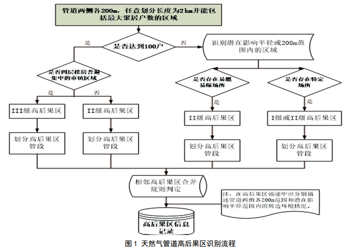 高后果區識別與評價(jià)是風(fēng)險管控的前提,天然氣管道高后果區識別依據為GB 32167―2015《油氣輸送管道完整性管理規范》,識別內容包括管道屬性、運行數據、環(huán)境數據、檢測維護數據、應急資源信息、人口分布、建構筑物屬性等數據。識別范圍為①潛在影響半徑小于200米的,收集范圍200米;②潛在影響半徑大于200米的,收集范圍按照潛在影響半徑收集。 識別流程如圖 1所示。