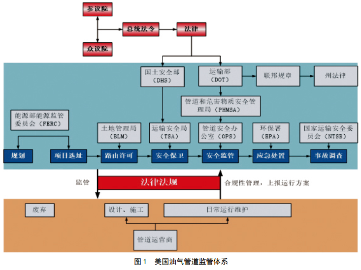 涵蓋原油、成品油和天然氣管道的規劃、項目選址、路由許可、安全監管、日常運行維護、事故調查、應急處置、廢棄等 “全生命周期”,美國政府均有明確的部門(mén)負責。聯(lián)邦法規要求各州建立直呼系統(one-call),并向國家響應中心(NRC)上報各類(lèi)管道及其周邊異常事件;管道安全辦公室(OPS)建立了國家統一管道地圖系統(NPMS),為管道監管、應急處置等提供決策支持;管道運營(yíng)商定期向OPS上報管道安全運行狀況,并接受其安全監督。